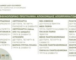 Το φθινοπωρινό πρόγραμμα αποκομιδής απορριμμάτων στις δώδεκα κοινότητες του Δήμου Δίου-Ολύμπου διαμορφώνεται ως εξής: Άγιος Σπυρίδωνας: Τρίτη και Παρασκευή Βροντού: Δευτέρα […]