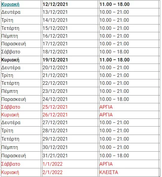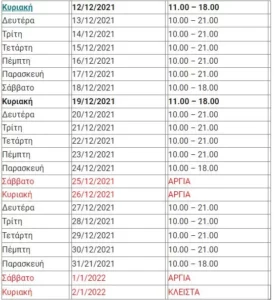 Το προτεινόμενο από τον Εμπορικό Σύλλογο Αθηνών ωράριο λειτουργίας των εμπορικών καταστημάτων για την εορταστική περίοδο των Χριστουγέννων 2021, έχει ως εξής:
