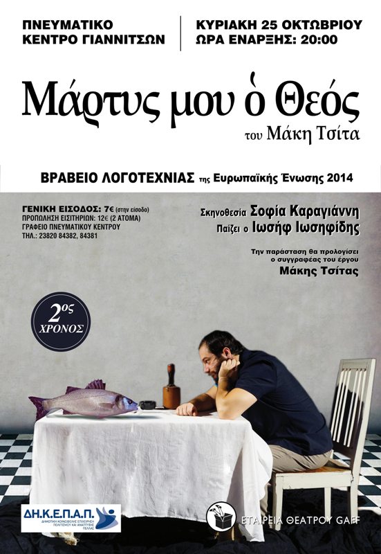 Η εταιρεία θεάτρου GAFF, σε συνεργασία με τη Δημοτική Κοινωφελή Επιχείρηση Πολιτισμού και Ανάπτυξης Πέλλας, παρουσιάζει την Κυριακή 25 Οκτωβρίου στις 8.00 μ.μ., στο Πνευματικό Κέντρο Γιαννιτσών, το έργο του Μάκη Τσίτα «Μάρτυς μου ο Θεός», που τιμήθηκε με το Βραβείο Λογοτεχνίας της Ευρωπαϊκής Ένωσης για το 2014.