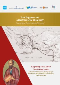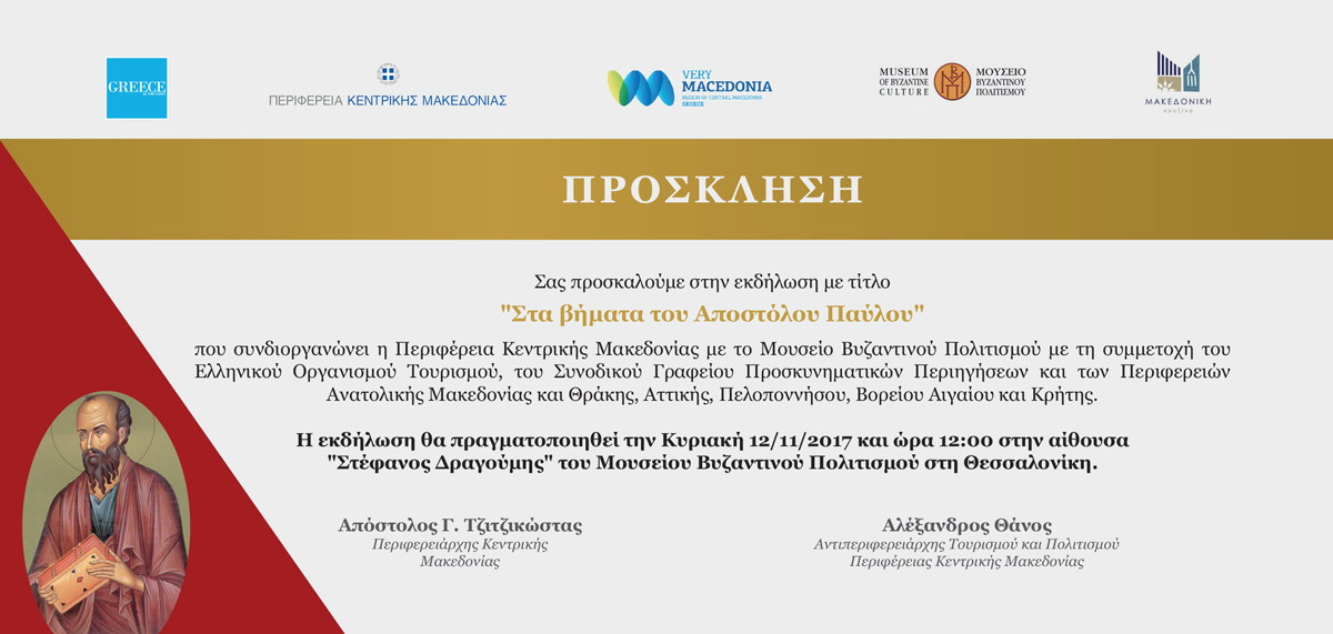 Την πρώτη διαπεριφερειακή εκδήλωση για το θρησκευτικό – προσκυνηματικό τουρισμό με τίτλο «Στα βήματα του Αποστόλου Παύλου» διοργανώνει η Περιφέρεια Κεντρικής Μακεδονίας την Κυριακή 12 Νοεμβρίου 2017 στις 12.00 το μεσημέρι στην αίθουσα «Στέφανος Δραγούμης» του Μουσείου Βυζαντινού Πολιτισμού στη Θεσσαλονίκη.