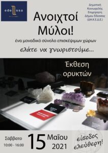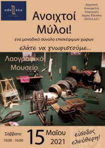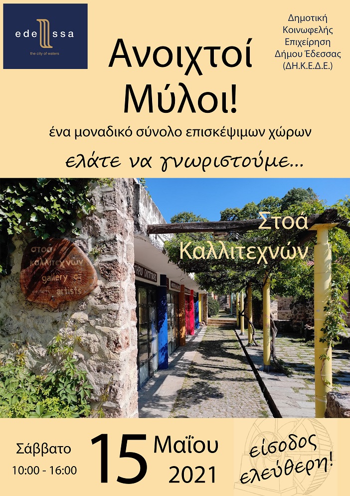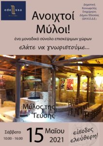 Ο Δήμος Έδεσσας και η Δημοτική Κοινωφελής Επιχείρηση (ΔΗΚΕΔΕ) υποδέχονται την έναρξη της τουριστικής περιόδου με «Ανοιχτούς Μύλους». Το Σάββατο, 15 Μαΐου 2021, από τις 10:00 έως και τις 16:00, όλοι οι επισκέψιμοι χώροι της Έδεσσας θα είναι ανοιχτοί και προσβάσιμοι στο κοινό δωρεάν.